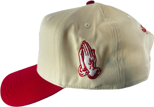 5 Panel Mid Profile Baseball Cap natural cream and red color